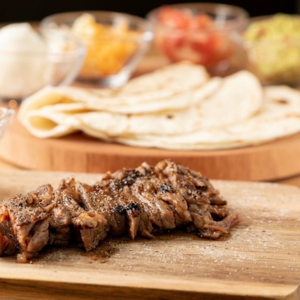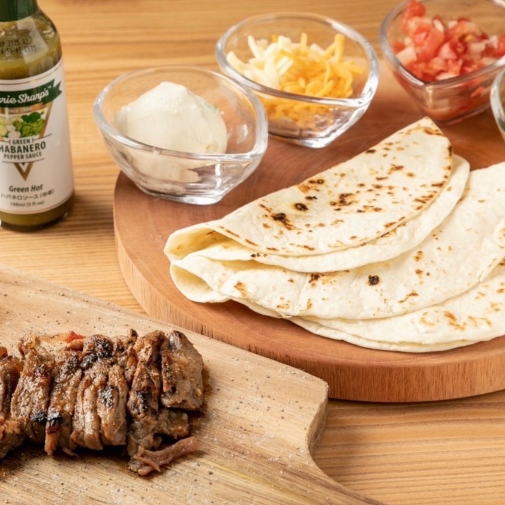 そんなソフトタイプのタコスをファヒータ(ファジータ)のような形でオリジナルサルサ、ワカモレ(ワカモーレ)、チーズ、サワークリームをお好みで包んでお召し上がりいただけます。