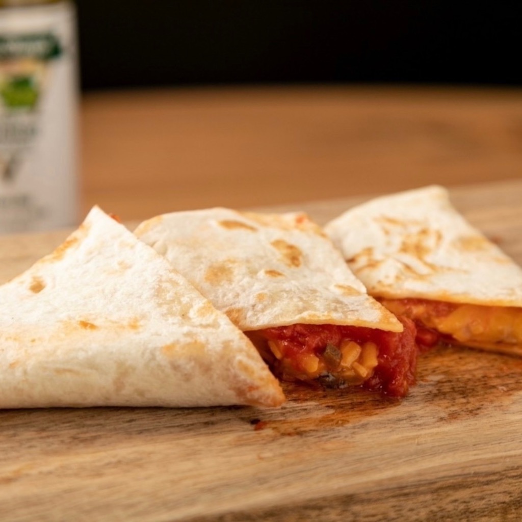トルティーヤの生地の間に野菜を豊富に入れたBALMIL特性サルサソースと2種類のチーズをとろとろに溶かしたのを挟みお召し上がりいただいております。